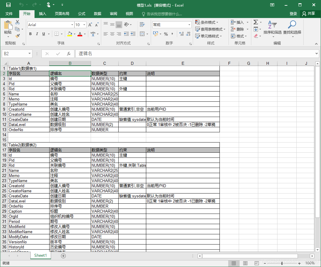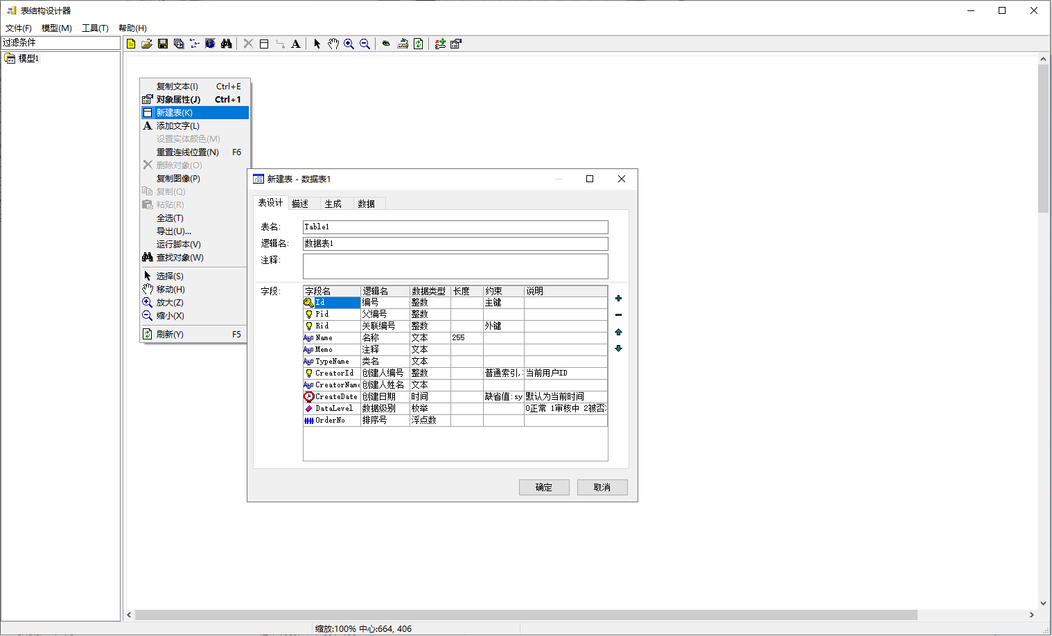 在模型图上双击“数据表1”,弹出该表的属性编辑界面,可以添加删除字段,或进行拖动排序等操作,可直接修改表名、逻辑名、注释和字段的物理名、逻辑名、类型、约束: