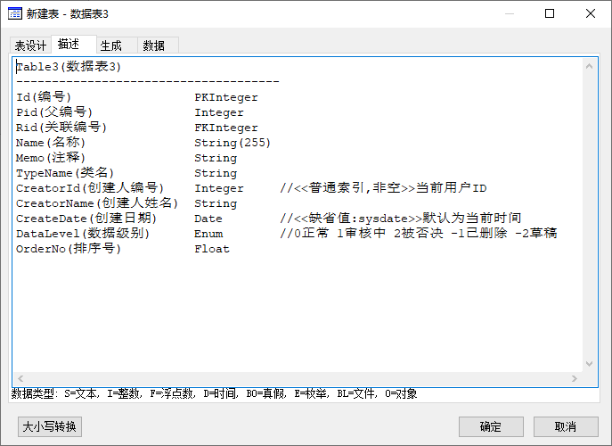 表的描述字中,可以输入简写字母代替数据类型,S,I,F,D,BO,E,BL,O分别代表文本,整数,浮点数,时间,真假,枚举,文件,对象。