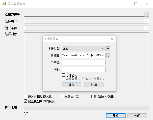 其中“自动大小写”的意思是自动对表名和字段名进行首字母大小处理(如USERINFO会处理为UserInfo,系统根据字典文件dict.txt进行处理,如果对处理结果不满意,可修改字典文件增加你需要的词语);“注释转为逻辑名”意思是把表或字段的注释作为逻辑名称导入。