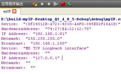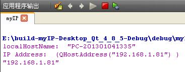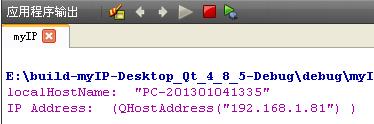 调用QHostInfo类的fromName()函数,使用上面获得的主机名为参数,来获取本机的信息。然后再利用QHostInfo类的addresses()函数,获取本机的所有IP地址信息。运行程序,输出信息如下: