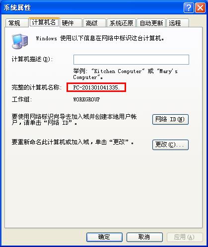 可以看到,这里获取了计算机名。我们可以在桌面上“我的电脑”图标上点击鼠标右键,然后选择“属性”菜单,查看“计算机名”一项,和这里输出结果是一样的,如下图。