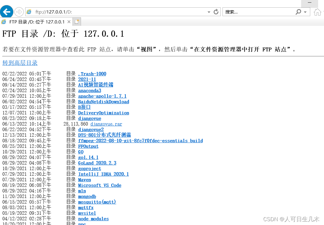 ftp://127.0.0.1/D: 即可查看文件夹下所有的文件,其中127.0.0.1为本机地址,可根据实际情况修改。