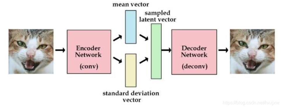 其实原理特别简单, 只需要在编码过程给它增加一些限制, 迫使其生成的隐含向量能够粗略的遵循一个标准正态分布, 这就是其与一般的自动编码器最大的不同。这样我们生成一张新图片就很简单了, 我们只需要给它一个标准正态分布的随机隐含向量, 这样通过解码器就能够生成我们想要的图片, 而不需要给它一张原始图片先编码。