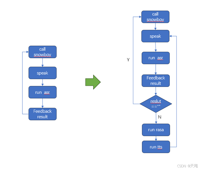 之前流程的不足之处就是无法正常对话,要说一句喊一次snowboy,很不方便。这次则改成喊一次snowboy后,就开始正常对话,直到无声后结束,然后重新再唤醒snowboy,开启下一轮对话。