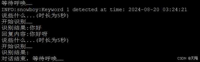 print("对话结束,等待呼唤……")