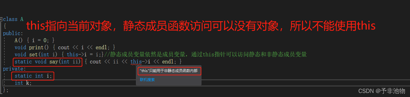 void set(int i) { this->i = i;}//静态成员变量依然是成员变量,通过this指针可以访问静态和非静态成员变量