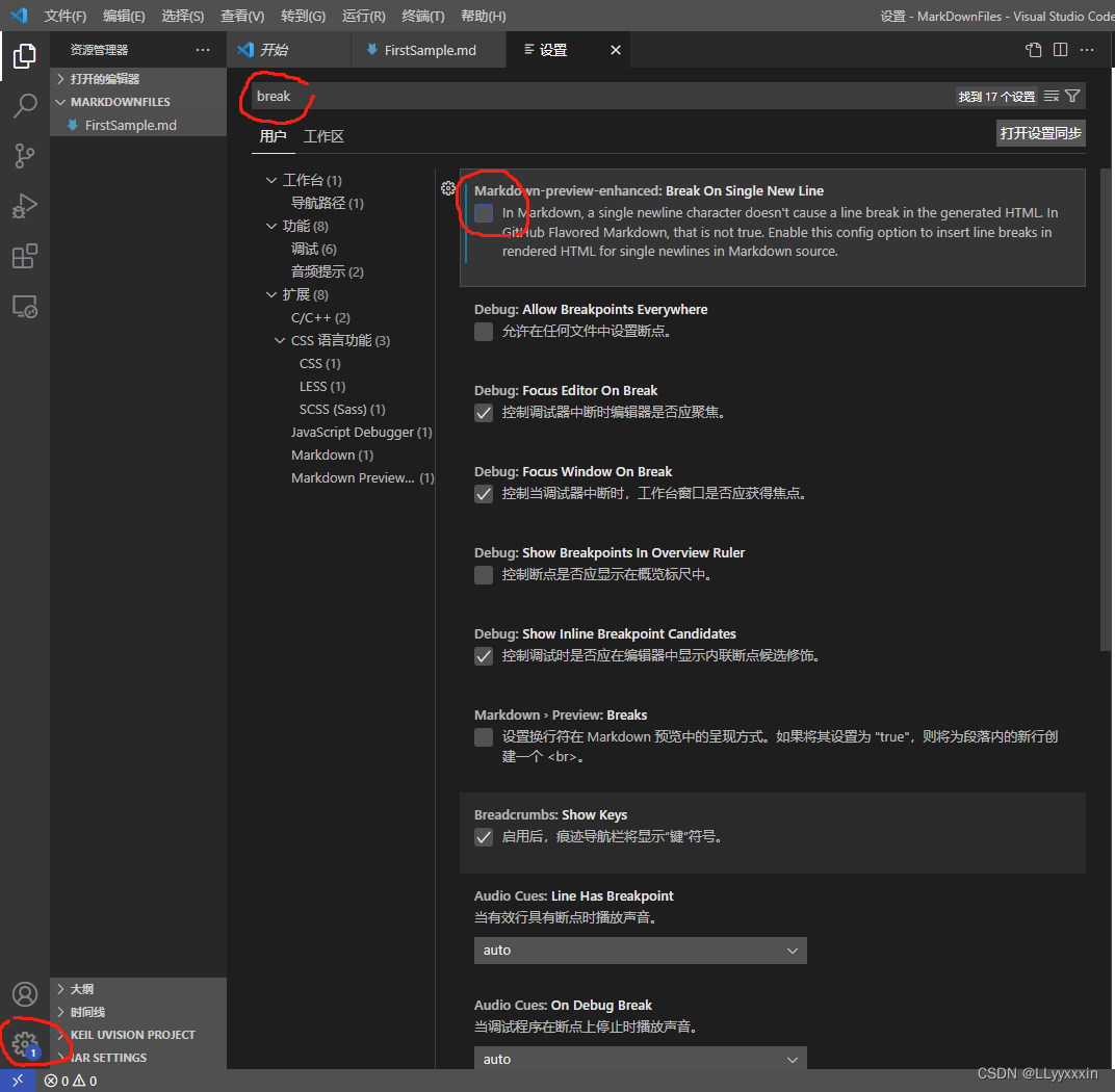 下载好所有插件重启生效后,需要修改一下设置,点击左下角齿轮按钮,在搜索框中输入break,将搜索选项中的Markdown Preview Ehanced:Break On Single New Line取消勾选。