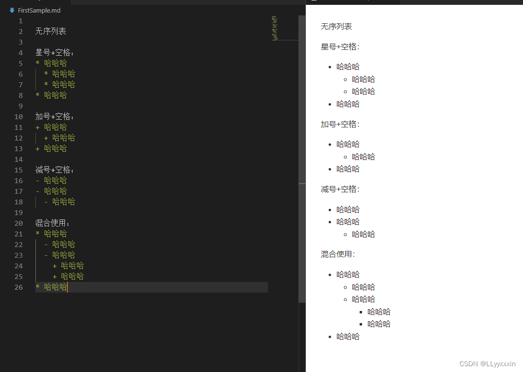 无序列表:输入星号"*"加空格或者加号"+"加空格或者减号"-"加空格