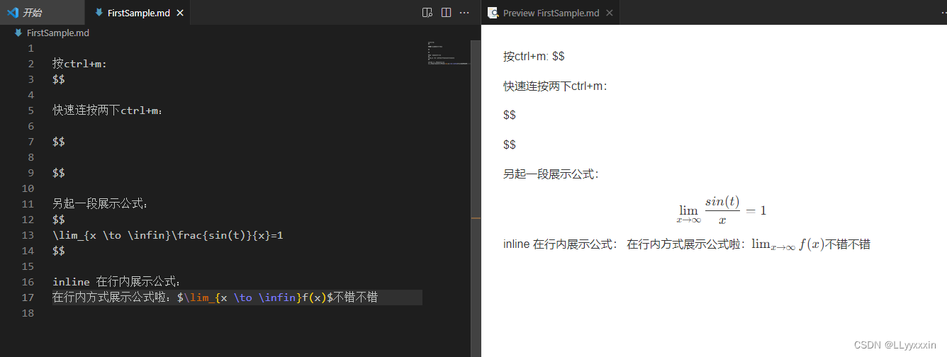 行内展示数学公式:用1个$$括起来 快捷键:ctrl+m