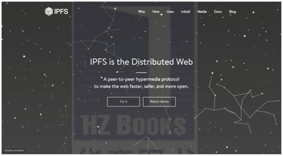IPFS(InterPlanetary File System)是一个基于内容寻址的、分布式的、新型超媒体传输协议。IPFS支持创建完全分布式的应用。它旨在使网络更快、更安全、更开放。IPFS是一个分布式文件系统,它的目标是将所有计算设备连接到同一个文件系统,从而成为一个全球统一的存储系统。某种意义上讲,这与Web最初的目标非常相似,但是它是利用BitTorrent协议进行Git数据对象的交换来达到这一个目的的。IPFS正在成为现在互联网的一个子系统。IPFS有一个更加宏伟而疯狂的目标:补充和完善现有的互联网,甚至最终取代它,从而成为新一代的互联网。这听起来有些不可思议,甚至有些疯狂,但的确是IPFS正在做的事情。图1-1所示为IPFS的官方介绍。