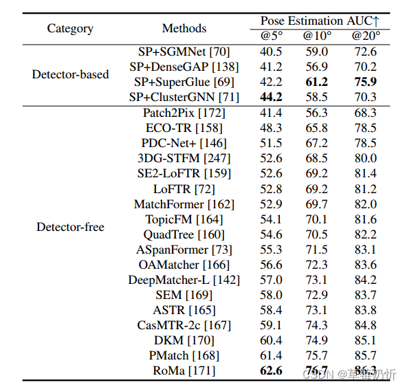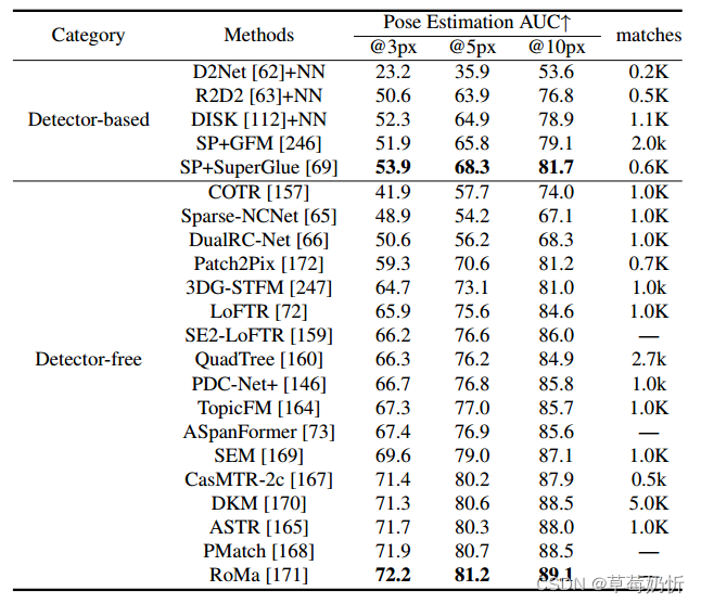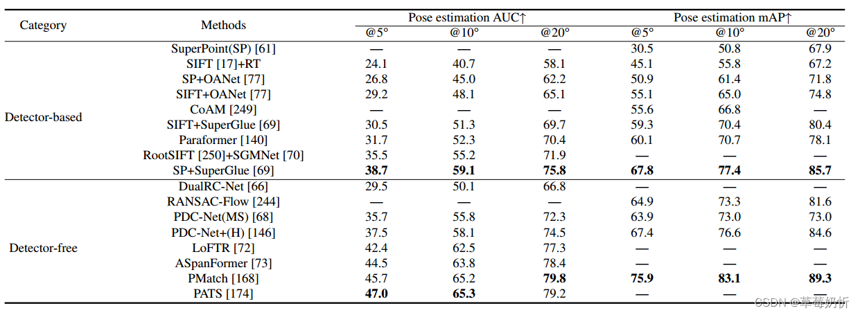 表2:ScanNet [225] Two-View Camera Pose Estimation。我们比较了两组方法,Detector-based方法和Detector-free方法。