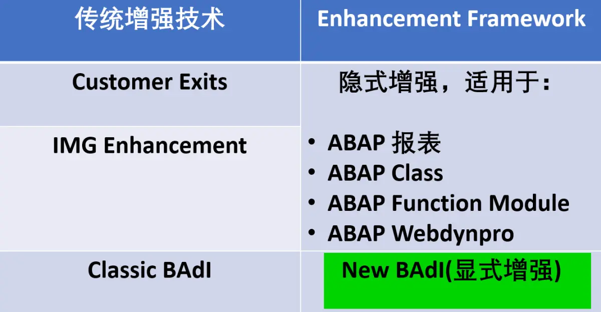 本教程前一篇文章,已经介绍了 Enhancement Framework 里的一种显式增强技术(下图绿色区域所示)New BAdI 的技术原理: