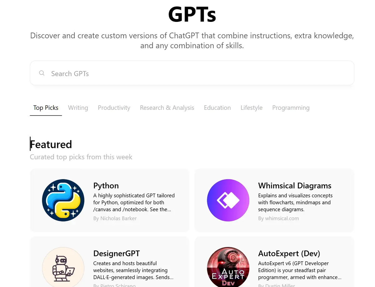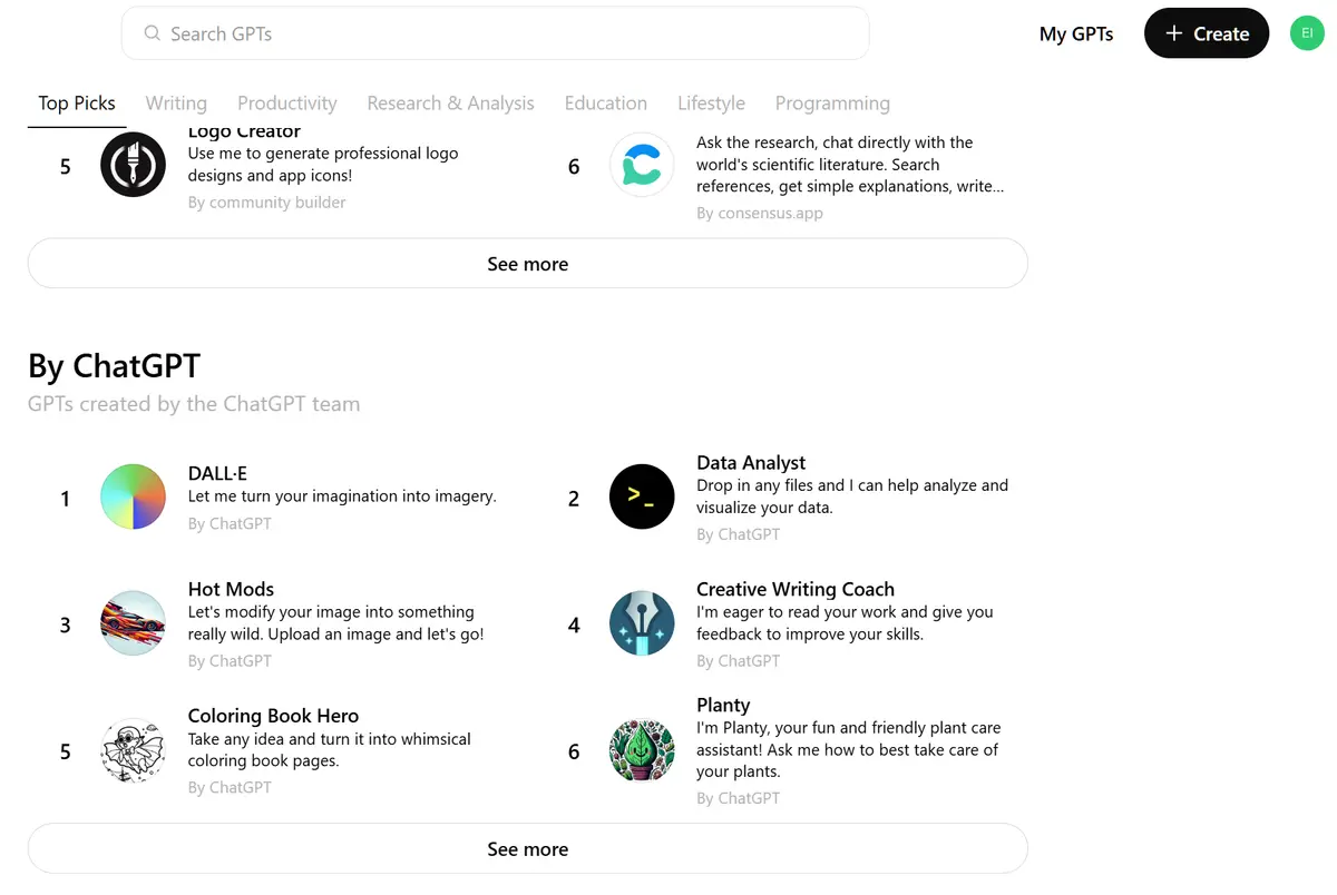 自 GPT Store 上线以来,平台上涌现了大量由用户和开发者创作的GPT应用,涵盖了生产力工具、图像生成、写作、编程/软件开发、数据分析等多个领域。