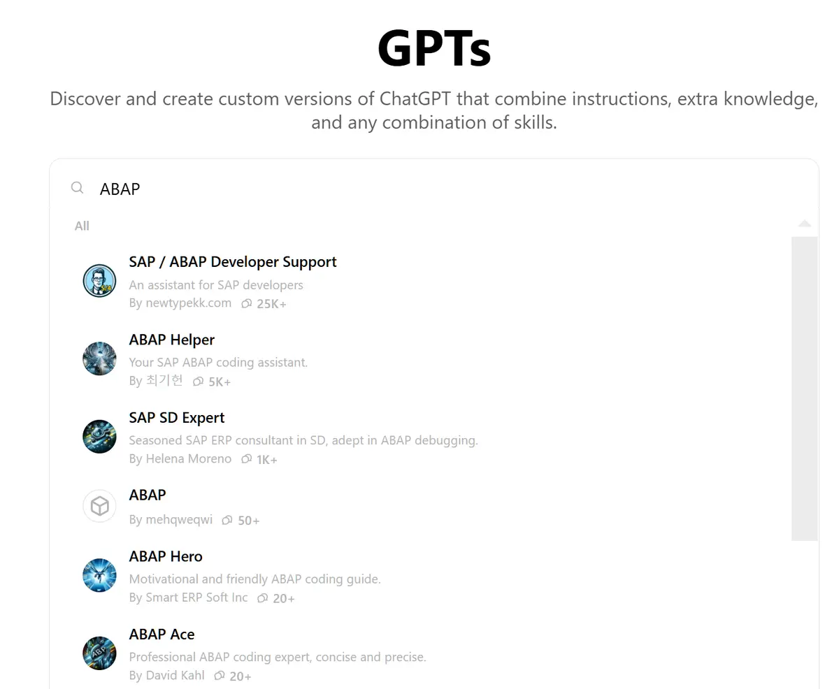 因为笔者工作中以 ABAP 编程为主,所以在 GPT Store 里使用的最多的也是和 ABAP 相关的定制化 GPT,如下图所示。