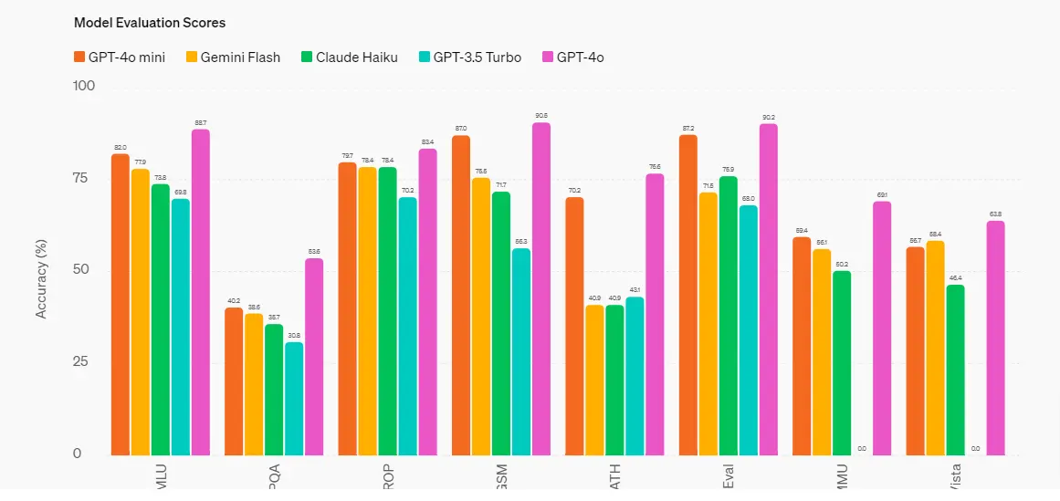 下图解释了 4o(紫色)和 4o-mini(深橙色)在 AI 模型各项评测中的得分,已经相差不大了。