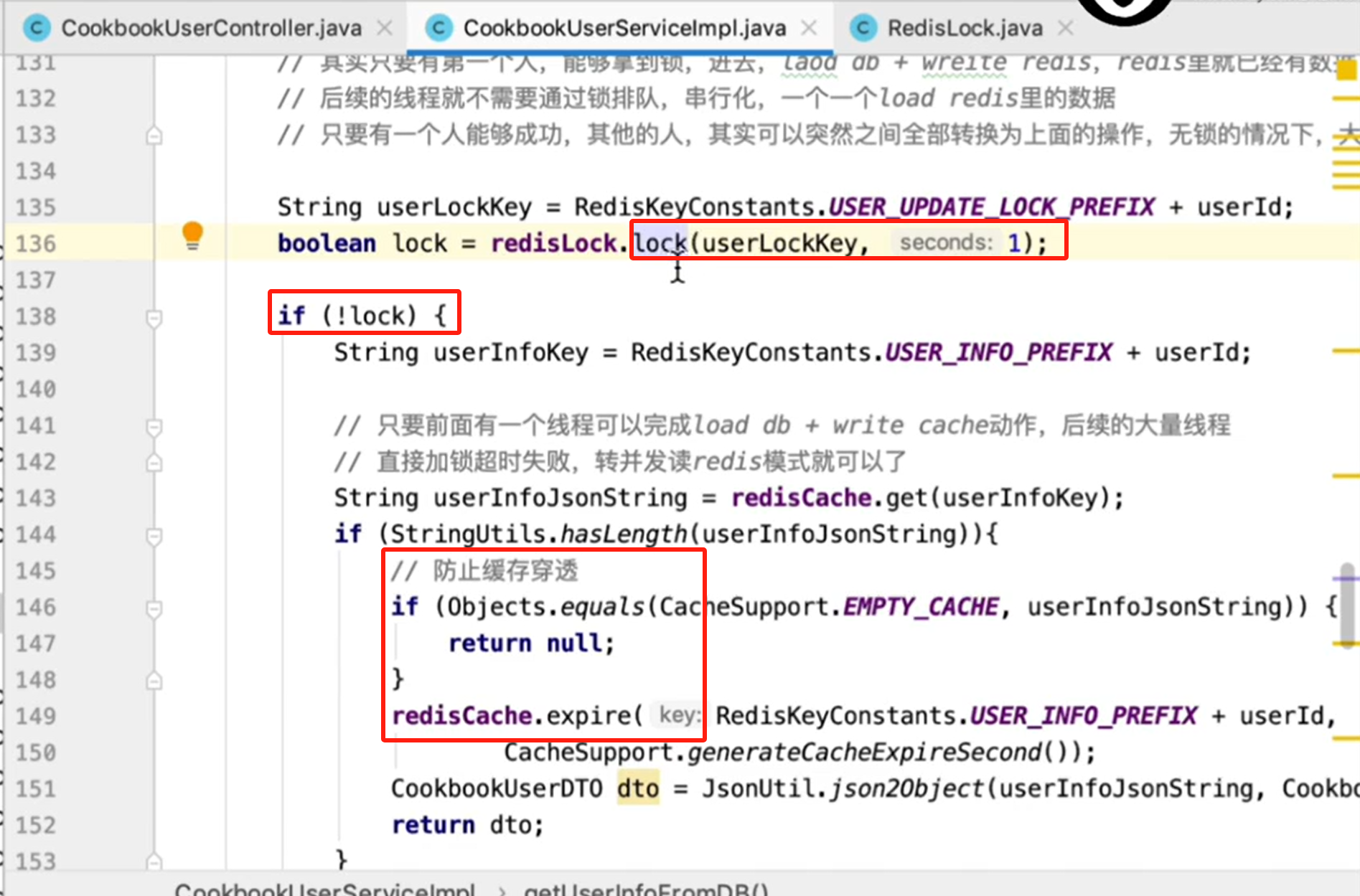 没有抢到锁的,直接在143行,重新去读一次redis,防止多个线程每个都重复的等待获取锁,获取到锁都会走一遍先查DB再回写redis的过程