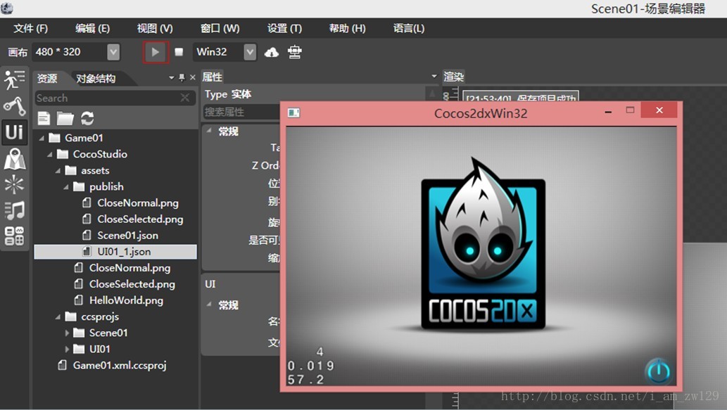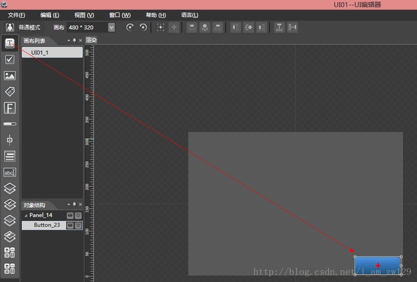 下一步就是创建按钮了,双击UI文件,CocoStudio会自动打开UI编辑器:
