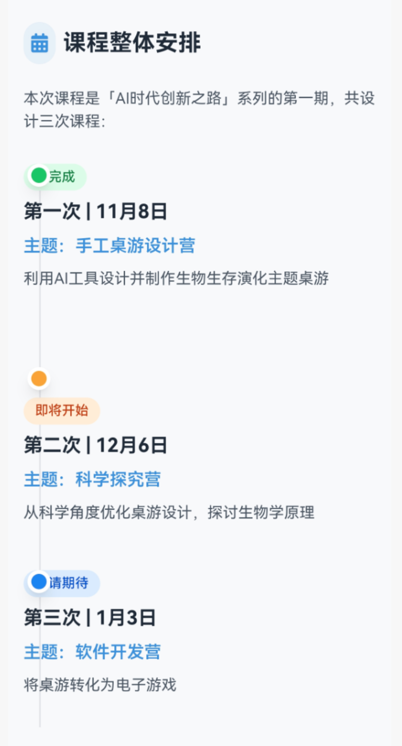 上周六,我们在给孩子上“AI辅助桌游设计课”的时候尝试了一下,全天全程录音。然后处理后直接生成了给家长的“课程小结”。