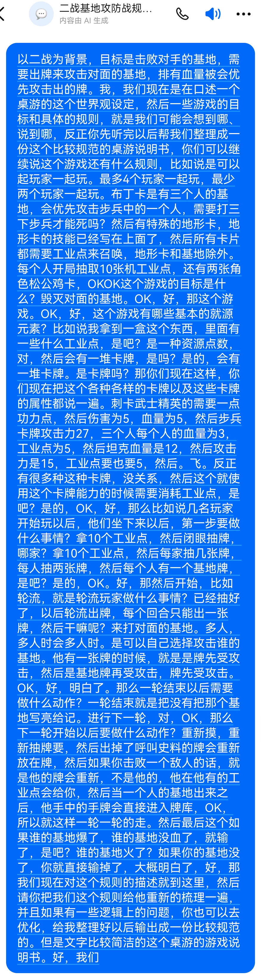 这是我和娃的对话,全部混合记录了,里面诸如“OK这个游戏的目标是什么”、“OK,好,那么比如说几名玩家开始玩以后,他们坐下来以后,第一步要做什么事情”、“那么一轮结束以后需要做什么动作”,就是我给娃的“提示词”。