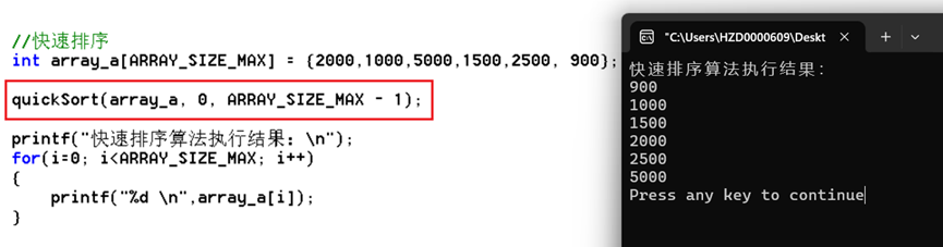// 交换两个元素的值void swap(int* a, int* b) {int temp = *a;*a = *b;*b = temp;}// 分区函数,返回基准元素的最终位置int partition(int arr[], int low, int high) {int pivot = arr[high]; // 选择最后一个元素作为基准int i = (low - 1); // i是小于基准的元素的索引for (int j = low; j <= high - 1; j++) {// 如果当前元素小于或等于基准if (arr[j] <= pivot) {i++; // 增加iswap(&arr[i], &arr[j]); // 交换元素}}swap(&arr[i + 1], &arr[high]); // 将基准放到正确的位置return (i + 1);}// 快速排序主函数void quickSort(int arr[], int low, int high) {if (low < high) {// pi是分区索引,arr[pi]现在在正确的位置int pi = partition(arr, low, high);// 分别对分区前后的子数组进行排序quickSort(arr, low, pi - 1);quickSort(arr, pi + 1, high);}}