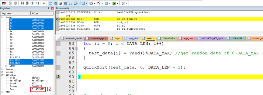 使用硬件板子在Keil软件上测试了排序100个随机数据的算法执行时间:
