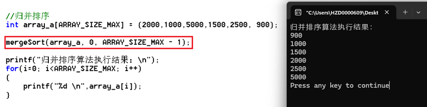// 合并两个已排序的子数组void merge(int arr[], int left, int mid, int right) {int i, j, k;int n1 = mid - left + 1; // 左子数组的大小int n2 = right - mid; // 右子数组的大小// 创建临时数组int *L = (int *)malloc(n1 * sizeof(int));int *R = (int *)malloc(n2 * sizeof(int));// 拷贝数据到临时数组for (i = 0; i < n1; i++)L[i] = arr[left + i];for (j = 0; j < n2; j++)R[j] = arr[mid + 1 + j];// 合并临时数组回原数组i = 0; // 初始化左子数组的索引j = 0; // 初始化右子数组的索引k = left; // 初始化合并子数组的索引while (i < n1 && j < n2) {if (L[i] <= R[j]) {arr[k] = L[i];i++;} else {arr[k] = R[j];j++;}k++;}// 拷贝左子数组剩余的元素(如果有)while (i < n1) {arr[k] = L[i];i++;k++;}// 拷贝右子数组剩余的元素(如果有)while (j < n2) {arr[k] = R[j];j++;k++;}// 释放临时数组内存free(L);free(R);}// 归并排序主函数void mergeSort(int arr[], int left, int right) {if (left < right) {// 计算中间点,避免溢出int mid = left + (right - left) / 2;// 递归排序左半部分mergeSort(arr, left, mid);// 递归排序右半部分mergeSort(arr, mid + 1, right);// 合并已排序的两部分merge(arr, left, mid, right);}}
