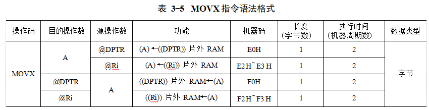 MOVX指令用于片外RAM或I/O端口与累加器A之间的数据传送,指令语法格式见表3-5。