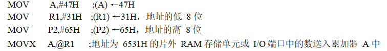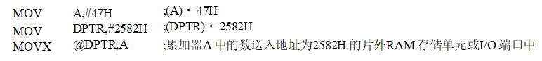以累加器A为目的操作数的MOVX指令是输入指令,将由@DPTR或@Ri所指定的片外RAM单元或I/O端口的8位数据送入累加器A。反之,以累加器A为源操作数的MOVX指令是输出指令。