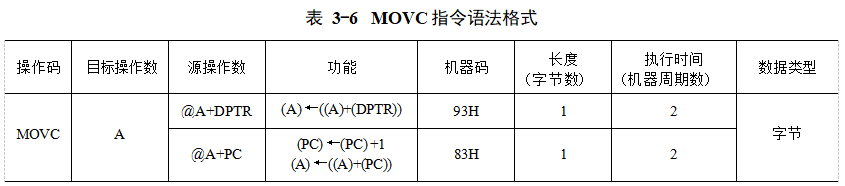 MOVC指令用于读取程序存储器(ROM)中的数据,其指令语法格式见表3-6。MOVC指令只能将数据从ROM中取出并送入累加器A,反之则不可以,因为ROM是只读型存储器,其存储内容不能修改。