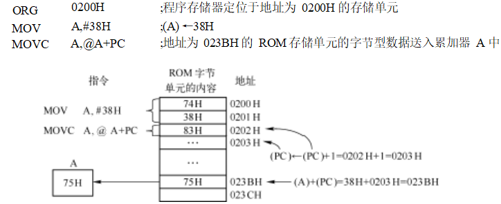 【例3-31】MOVC指令,操作数包含PC。程序段及其在ROM中的存放如下: