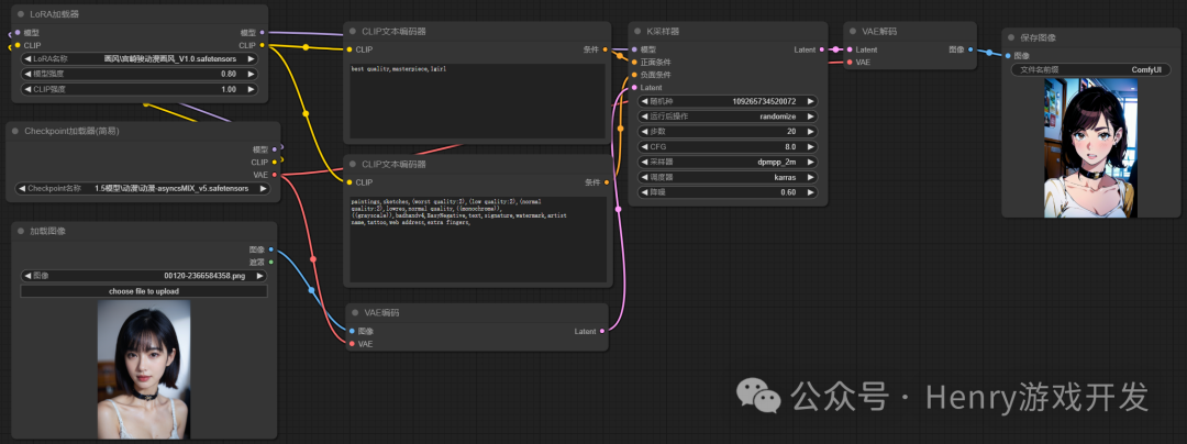 通过简单地加两个节点,即把工作流改为了最基础的图生图模式,如以下工作流就是一个简单通过动漫大模型把真人转动漫的工作流,其中K采样器的降噪也就是对应WebUI中的重绘幅度,这个值越大生成图像越靠近提示词,越小则越靠近参考图像,我这里用的 0.6,看情况调整即可