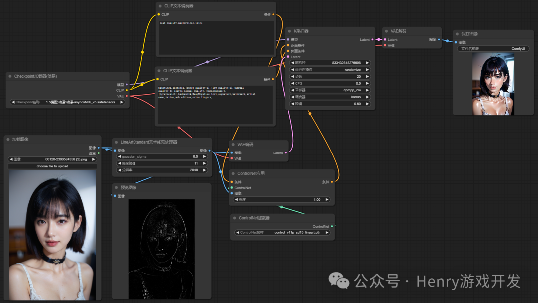 预处理器的作用是选择需要对图像进行的控制方向,这里我们以线条控制为例,让预处理器导出一份预览图像,这样我们能直观的看到预处理的结果