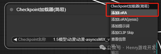 我们可以直接通过右键checkpoint加载节点即可添加lora节点