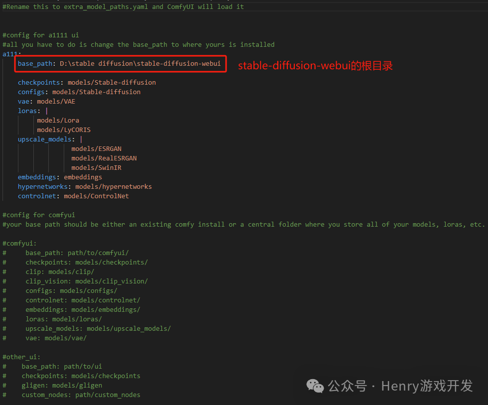 • 这里分两种情况,如果你之前装了webui,并且本身已经下了很多模型了,那么恭喜你,ComfyUI对webui的模型地址做了兼容,可以通过一个配置文件即可与webui共享模型 解压后的根目录,有“extra model_paths.yaml.example”文件,我们对这个文件进行修改