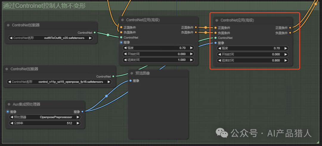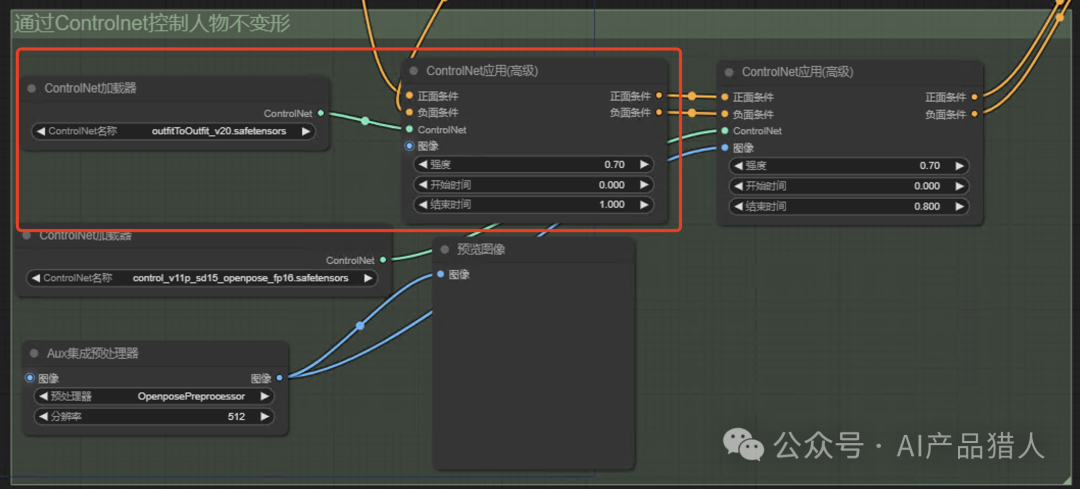 这是根据思路拆解出来的工作流:本质上就是用Contronet来控制人物的基础动作和造型;然后通过一个换衣的Contronet插件来实现一键换衣;