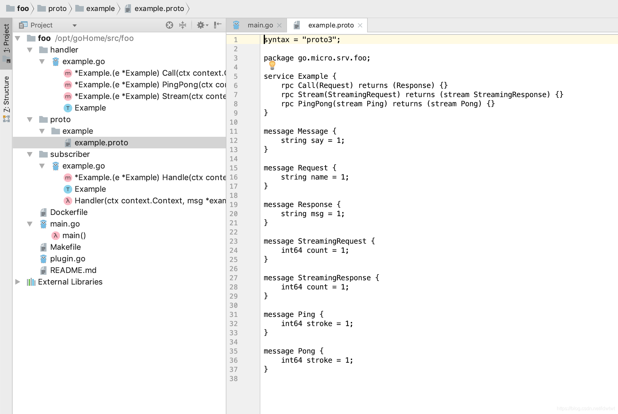 生成模板后,我们需要将Protobuf原型文件编译下,需要注意的是插件要使用micro(如果使用过gRPC可以类比)