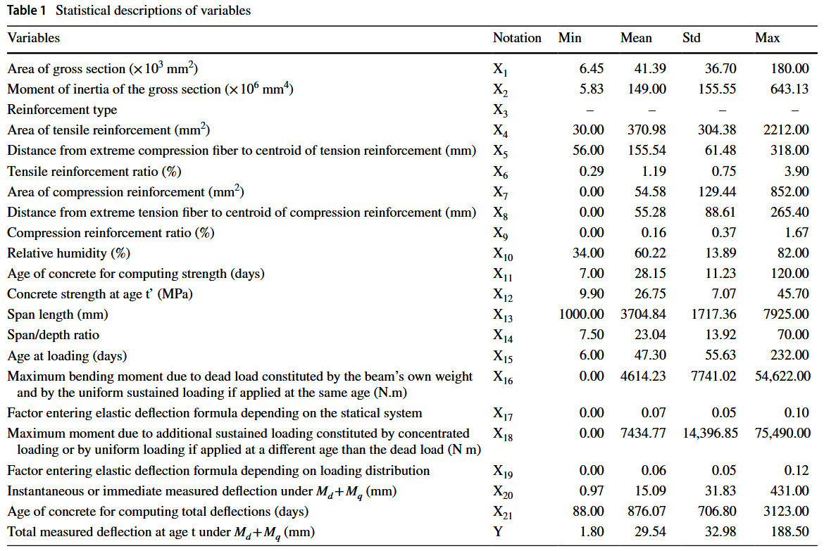 本文所采用的钢筋混凝土梁长期挠度数据集来源于之前在世界各地进行的实验工作中收集的包含217个测试的数据集。详细的数据库由Espion[2]从29个不同的研究计划中总结和记录。