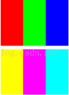 这可不是某国家的三色旗(相信不会有哪个国家会给国旗配以如此这么难看的颜色),我只是简单地绘制了6个色块,上面三种颜色分别为#FF0000,#00FF00和#0000FF,即一个通道是255,另外两个通道是0,下面三种颜色恰好相反,两个通道是255, 一个通道是0,即#FFFF00,#FF00FF和#00FFFF。