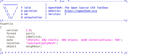 最后我们再确定网格之间的连接关系,我们知道对于一个内部的网格面,它实际上连接着两个网格的,在前一步中我们已经指定了它从属于哪一个网格,因此再下一步中我们只需要指定它与哪一个网格相邻就可以了,相关的信息就存储在neighbor文件中。