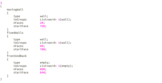 代码的首行为边界的数量,括弧内为各个边界的详细定义,其中的movingWall就是用户给边界定下的名称。对于每一个边界大括号内给定了与这个边界名称相关的三个参数:type设定了这个边界的类型,nFaces表明了这个边界包含的面的数量,startFace指的是这个边界的起始面编号。