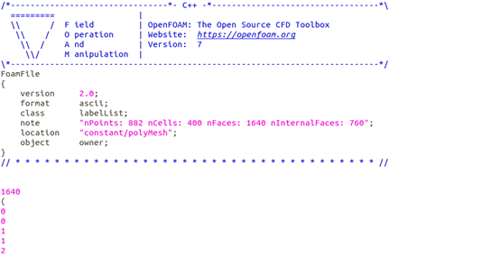 在有了面以后,我们就需要用这些面来生成网格单元。openFOAM中生成网格单元的方法是:首先计算系统内有多少个网格,然后给每个网格单元一个序号。接着在owner这个文件中,指定每一个面从属于一个特定的网格。这样当每一个面都被分配从属于一个特定的网格之后,相当于我们知道了每一个网格是由哪些面围成的。这样一来我们就知道了每一个网格的大小,形状和位置。owner文件示例如下: