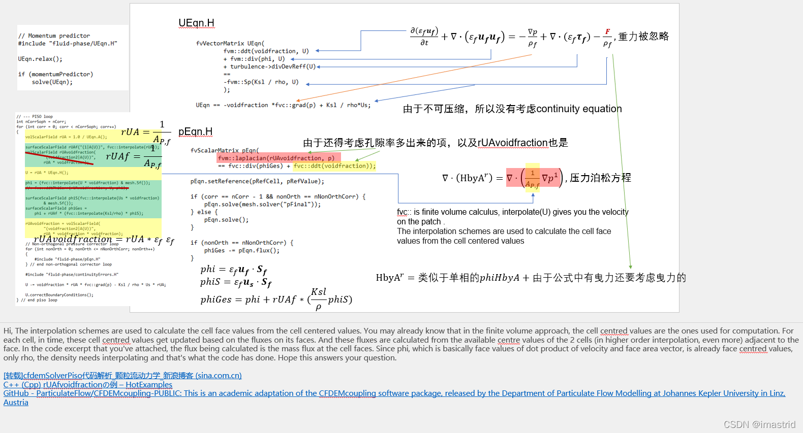 我也突然明白了PISO的动量预测并没有考虑压力的变化,直接求解了一个U,因此它求的U用来算下面的2.10的一部分。但除了U,还得考虑曳力,所以式2.10=phiGes=phi+曳力部分。根据式子也是可推导出它确实需要这么算。