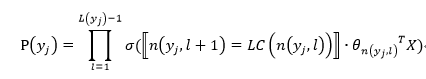 树的结构是根据类标的频数构造的霍夫曼树。K个不同的类标组成所有的叶子节点,K-1个内部节点作为内部参数,从根节点到某个叶子节点经过的节点和边形成一条路径,路径长度被表示为