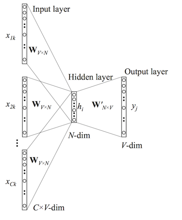 是被onehot编码过的V维向量,其中V是词汇量;隐含层是N维向量h;输出层是被onehot编码过的目标词y。输入向量通过