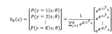 。给定一个测试输入x,我们的假设应该输出一个K维的向量,向量内每个元素的值表示x属于当前类别的概率。具体地,假设