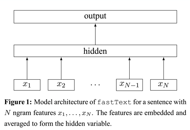 之前提到过,fastText模型架构和word2vec的CBOW模型架构非常相似。下面是fastText模型架构图: