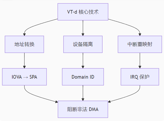 注释:VT-d 强制所有 DMA 请求必须通过地址转换,恶意访问会被立即阻断