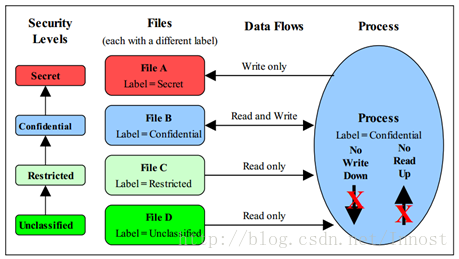 - 高级别的东西不能往低级别的东西里边写数据:这样可能导致高级别的数据泄露到低级别中。如图4中,Process的级别是Confidential,它可以往同级别的File B中读写数据,但是只能往高级别的File A(级别是Secret)里边写东西。
