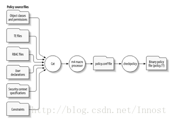 - 搞到一起后的文件中有使用宏的地方,这时要利用m4命令对这些宏进行拓展。m4命令处理完后得到的文件叫policy.conf。前面我们也见过这个文件了,它是所有安全策略源文件的集合,宏也被替换。所以,读者可以通过policy.conf文件查看整个系统的安全配置情况,而不用到图6中那一堆文件中去找来找去的。