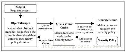 - Object Manager:管理着Object及相应的SContext。OM将向Access Vector Cache查询所要求的操作是否有权限。